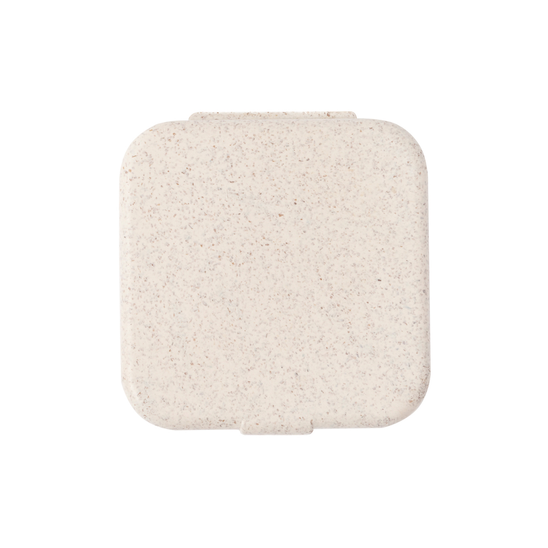 Útil portaclips fabricado en caña de trigo. Con cierre a presión y elaborada a partir de elementos reciclados, con 50 clips en su interior.La caña de trigo fomenta la utilización de materias primas naturales, reduciendo así las emisiones contaminantes.