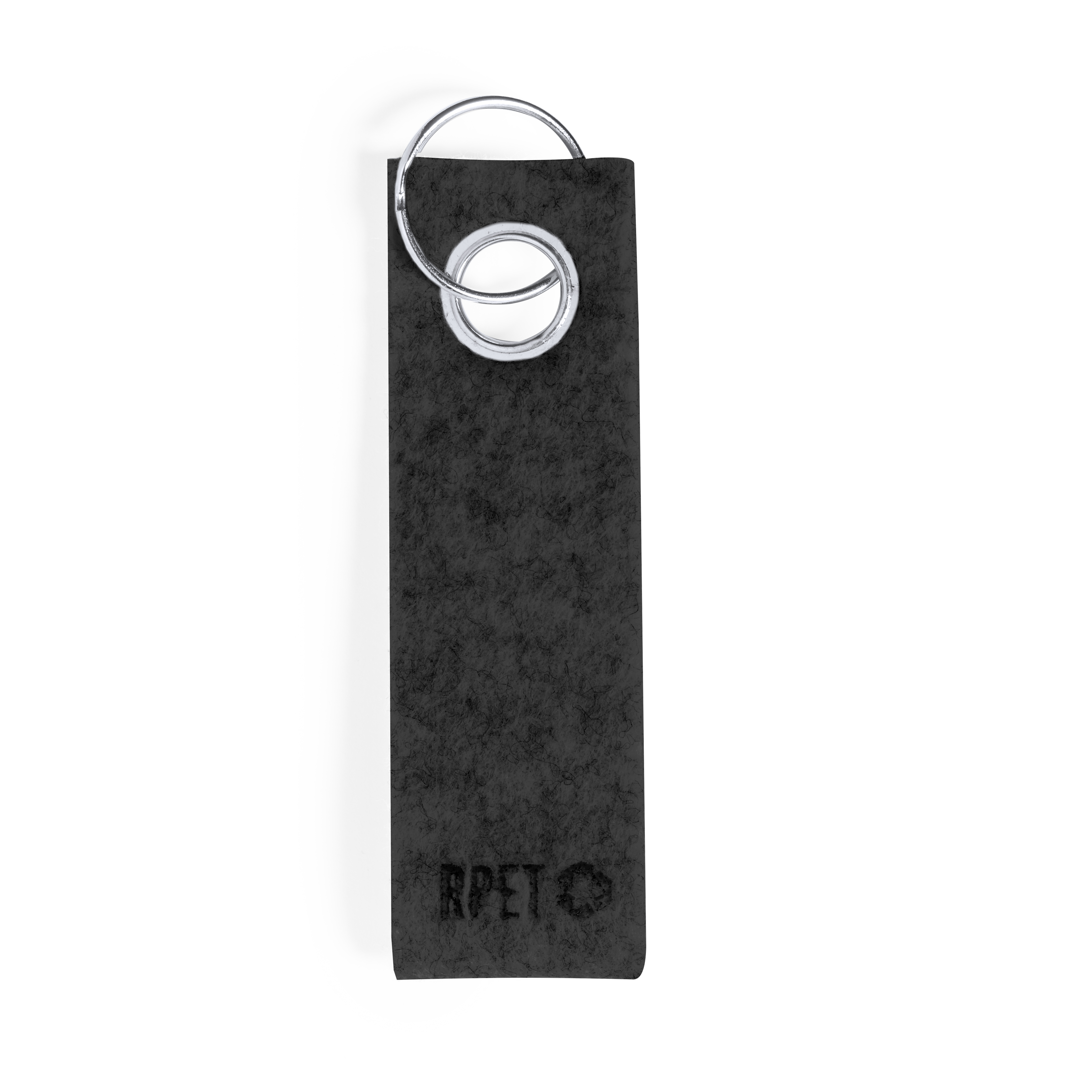 Elegante llavero con cinta fabricada en fieltro RPET y ojal metálico cromado. Con distintivo fieltro RPET en la cinta y anilla metálica cromada. El fieltro RPET es fruto de la combinación del proceso de reciclaje de materiales plásticos junto con la técnica milenaria de fabricación del fieltro, dando como resultado un material de eco-tendencia que, además de ser de origen reciclado, también se convierte en reciclable.